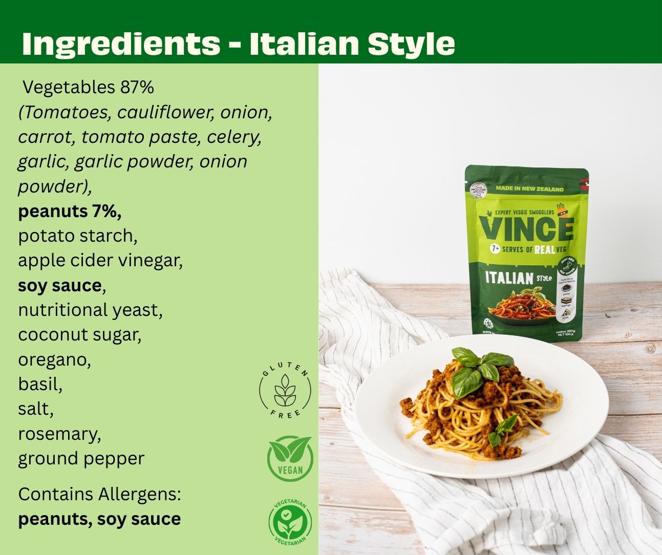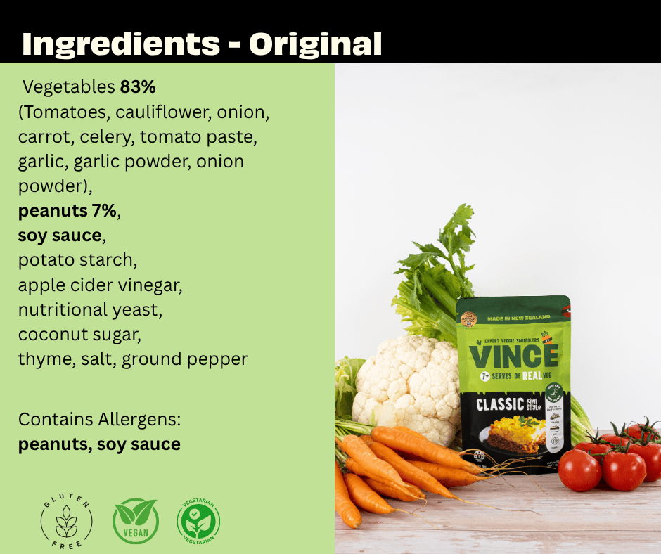 Vegetables 78% (tomatoes, cauliflower, onion, carrot, celery), tomato paste 8%, peanuts 7%, potato starch 2%, apple cider vinegar 2%, soy sauce (gluten free) 1%, nutritional yeast 1%, garlic 1%, coconut sugar 1%, herbs and seasoning 1% (oregano, basil, garlic powder, salt, onion powder, rosemary, ground pepper).